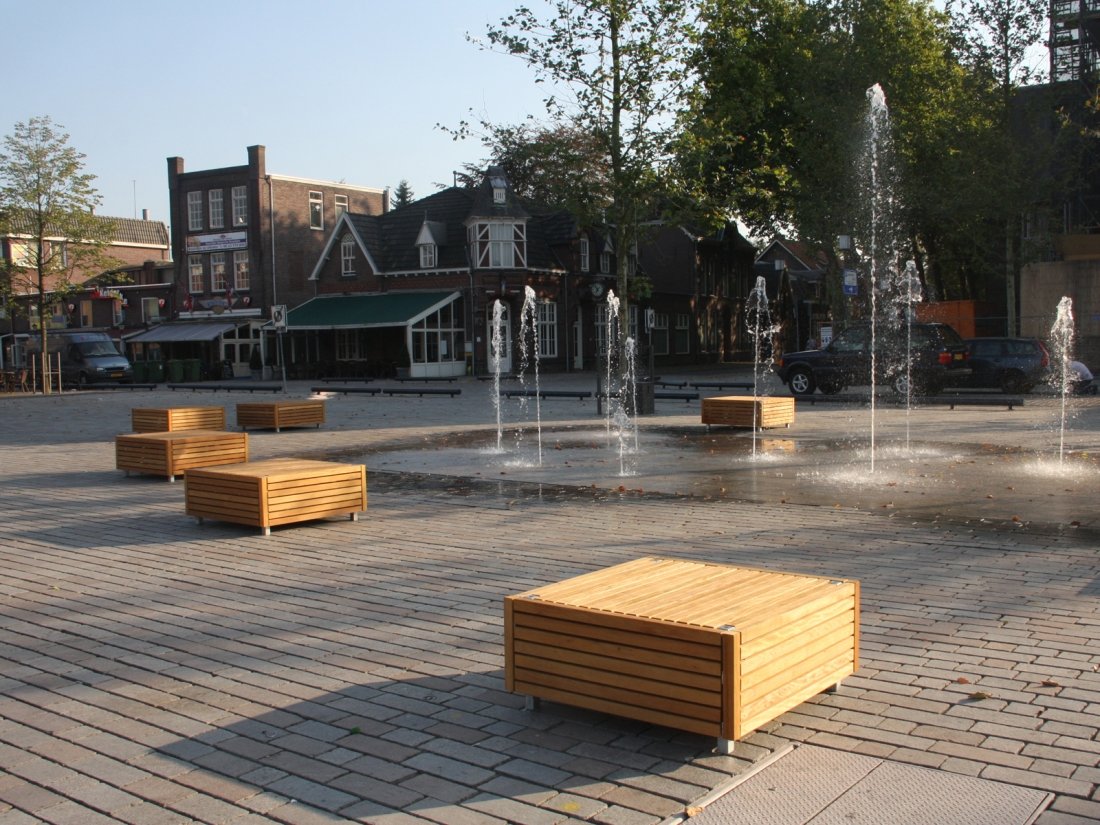 De Markt in Valkenswaard, NL Het ontwerp bepaalt dat de, tot op heden, doorlopende route kan worden omgekeerd, zodat de ruimte vrij is van verkeer. Om goed te worden verbonden met de tweede fase van de gerealiseerde stappen, werd besloten om te werken met natuursteen. Voor beide zaken heeft ANAE boomroosters en banken geleverd. De banken dienen gespreid te worden geplaatst, maar ze moeten ook passen bij de wekelijkse indeling van de markt. verder moeten ze makkelijk te demonteren zijn als er een festival aanstaande is. Om dit te kunnen veroorloven zijn er ankers geboord, in de steen, waarop de banken zijn aangesloten. De banken zijn extra stevig ontworpen zodat ze de lange zaterdag nachten kunnen doorstaan. externe Link: Valkenswaard, NL
